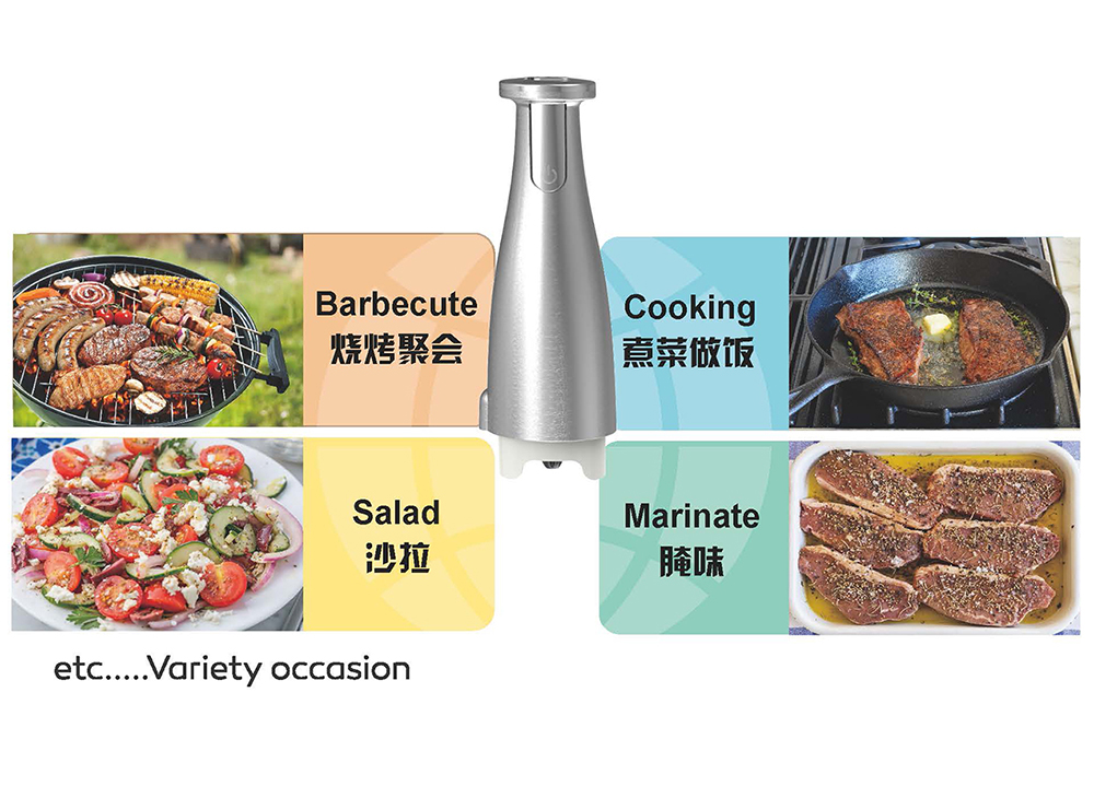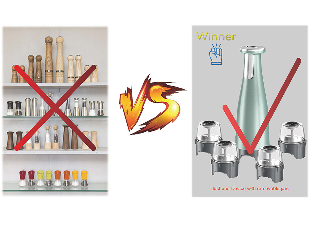 * Interchangeable miller jar for different ingredients like: Black peper, Sea salt, Rosmary, Basil leaves, Herbs and etc.